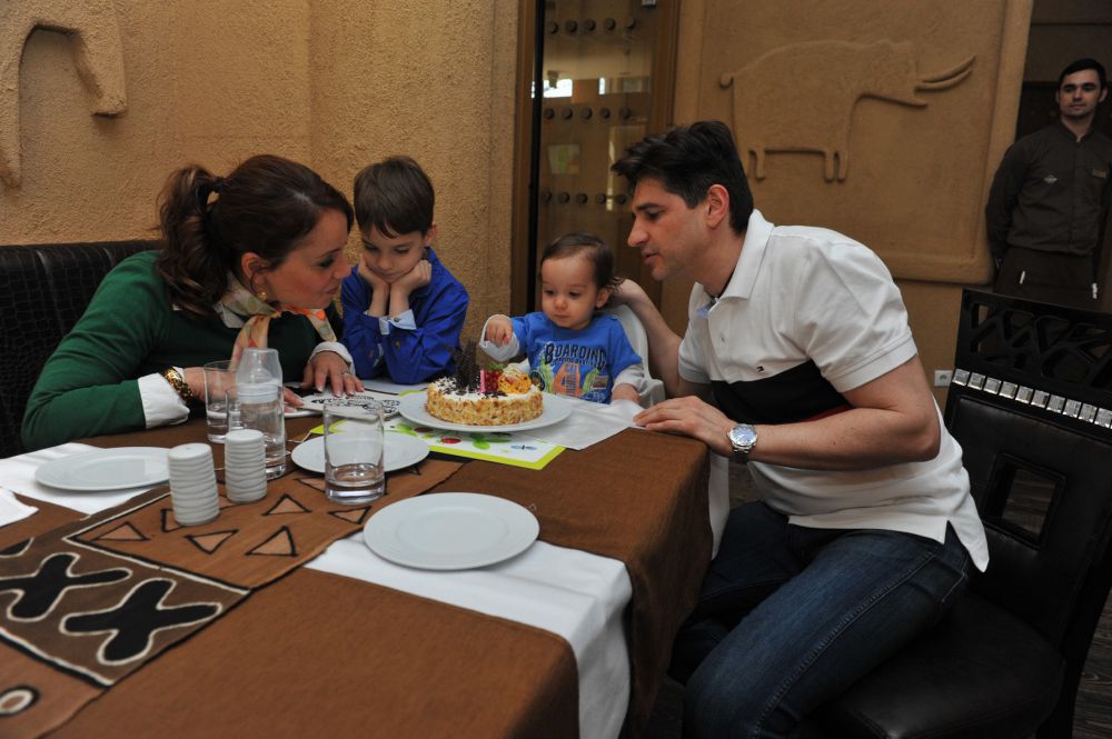 Természetesen a szülinapos köszöntése sem maradhatott el. Volt afrikai torta, gyertya, zene és szurikáta is. Bizsu, a szálloda kabala szurikátája egy tortával érkezett az ebédhez. A kis Adrián kikerekedett szemekkel figyelte. A gyertyát a szülőkkel közösen fújták el.